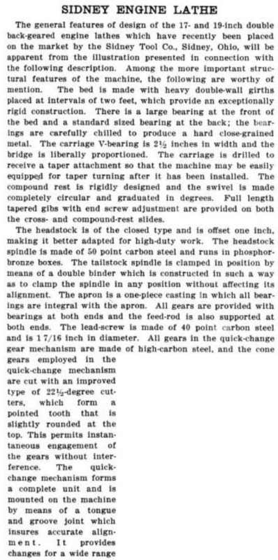 Title: 1915 article - Sidney's new 17" and 19" double back-geared engine lathes