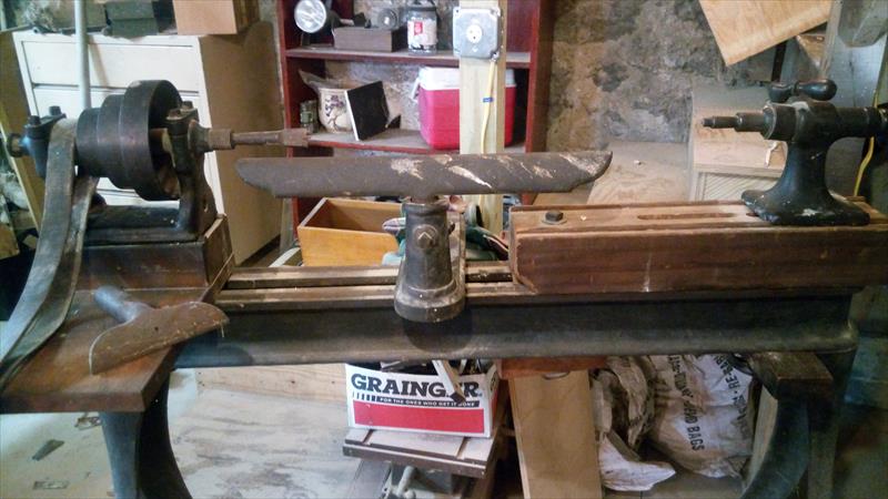Old wood lathe. Note, not Alcorn co. I had to pick a"badge" to list. No name or identifying marks. Four speed, leather belt. Head and tailstock on riser blocks. Looks like 1MT. No motor. Im guessing but I believe this was manufactured in New England. I'm interested in trading for workbench, old woodworking hand tools and the like. |