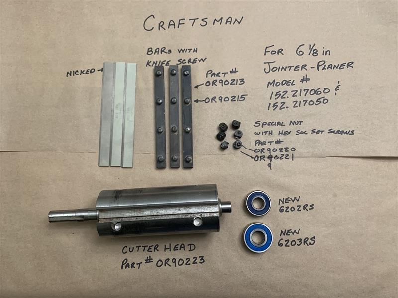 Selling Cutter Head parts only for Craftsmen Professional 6-1/8 inch jointer-planer. All parts being sold are shown in pictures. Note One blade has a nick but these are readily available. However the other parts are close to impossible to find.See pictures for part numbers and actual pieces of all parts being sold. Includes new bearings in pictures. |