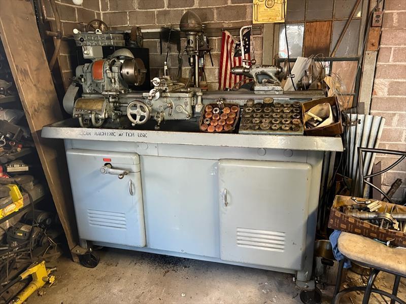 South Bend Lathe Heavy 10” 4.5’ Bed with chuck and 48 collets Quick change tool post, Knurling tool (3 head) Cabinet mount Catalog number CL 187R6 Serial no 11936 RKL16 3 phase motor