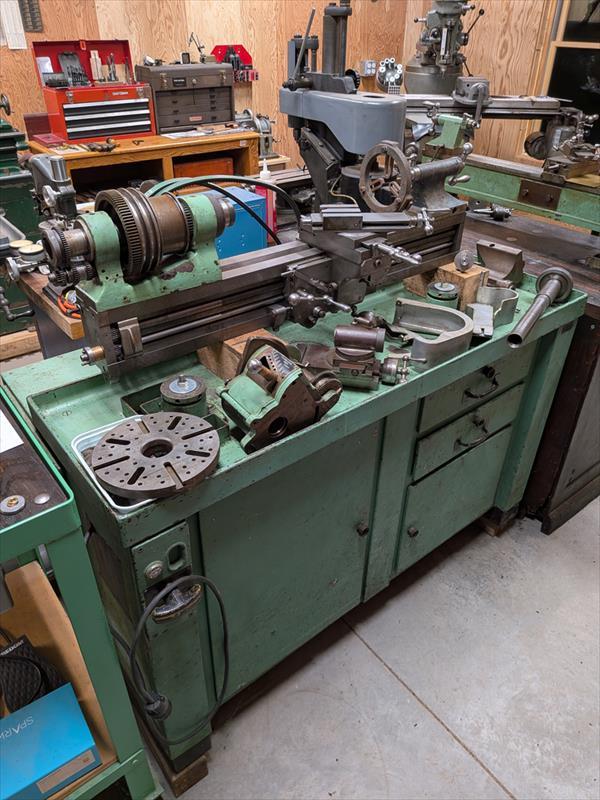 - green cabinet base - bed, carriage, and compound - (2) Tails stocks - large dial compound with older style tool holder - headstock - face plate - gearbox - 5C drawbar |