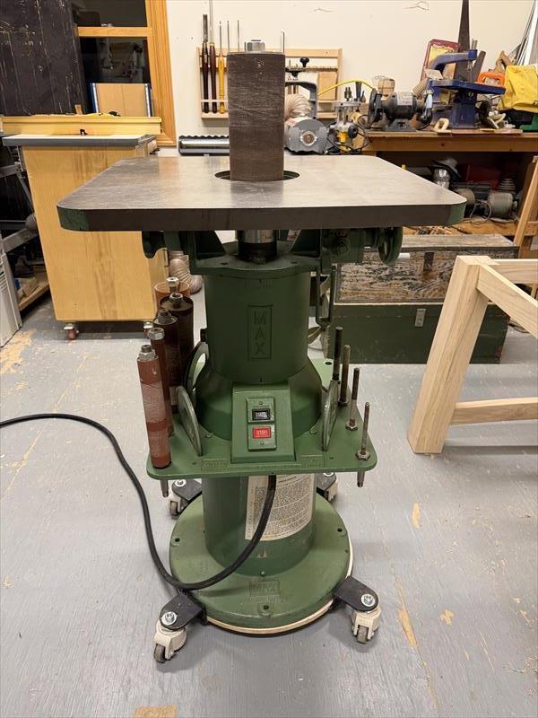 1 Hp, 3 phase oscillating spindle sander 24" x 24" table tilts to 45*. Includes a full complement of spindles including pneumatic drum, throat plates and a bunch of sanding sleeves of various sizes. Is on Zambus casters |