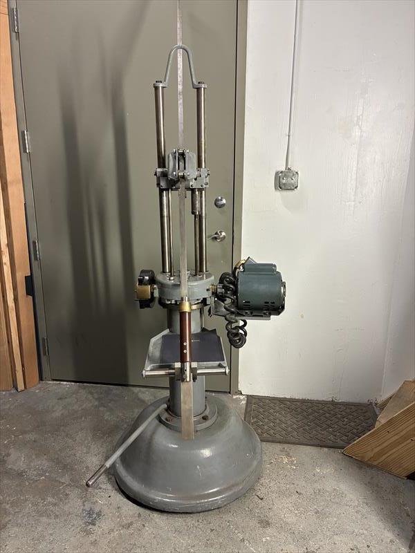 Anderson Bros power scraper made in Rockford, IL uses a dual gear rack arm with a scraper blade attached to transmit power from a rotating gear to the gear rack as you apply pressure down to the workpiece. A single 1/4 hp motor supplies power to the arm, the power feed for raising/lowering the height of the arm and an integrated grinder for sharpening blades. The lever in the base raises and lowers the machine onto central swivel casters allowing it to be moved around easily.