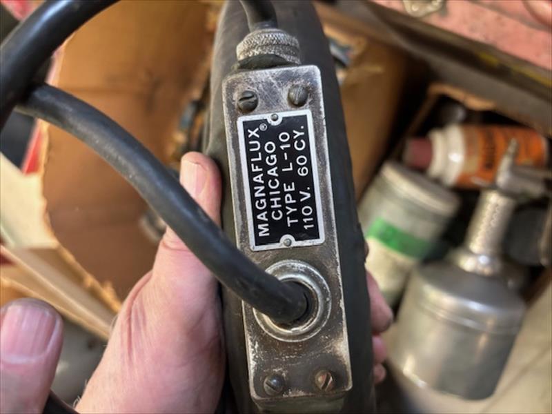 Magnaflux portable crack checker with black light & horseshoe magnet, Round magnet foot controller with sprayer and fluorescent sprays and powders. Transformer for light 60 cycles 60 amps All original paperwork in metal box |