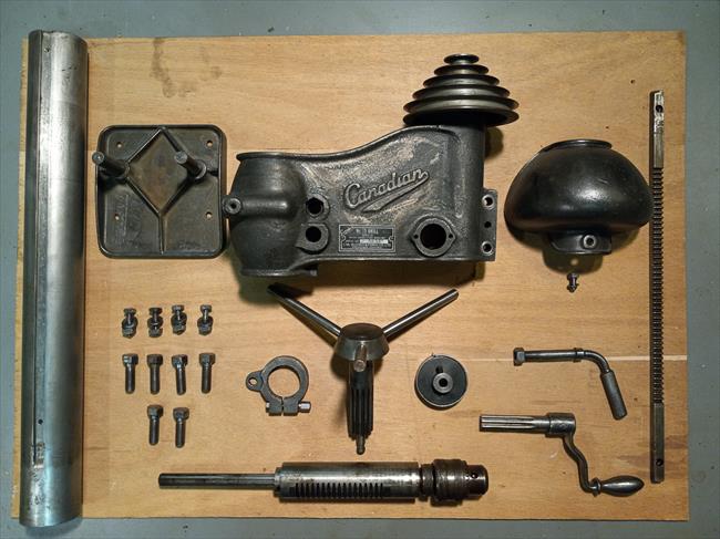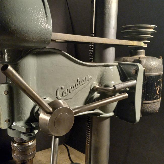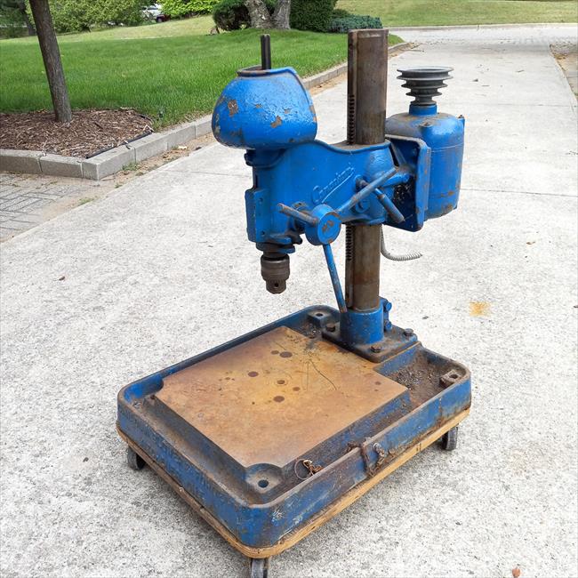 I saw this drill press for sale online, but it was about 7 hours away from me in Ottawa, Ontario. I didn't know much about it, but I was intrigued by the large table and the rack and pinion gears to raise and lower the head... and it was only $50. I was planning a trip to Ottawa, but not for a month or more, so I reached out to member of the Canadian Woodworking Forums who lived up there and he generously offered to pick it up and store it until I was able to retrieve it.