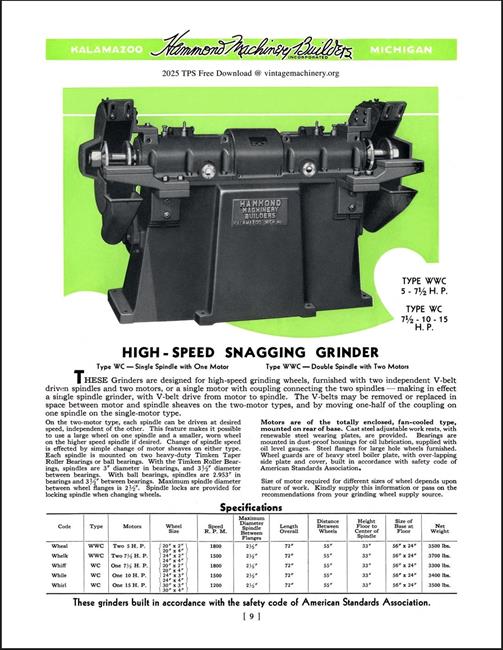This grinder came up for auction on Bidspotter and sold for roughly $150. It was located in Romeo, MI in a Ford Motor Plant that shutdown. The plant was built in the 1960s, but when I looked the grinder up I can only find it in a 1929 Hammond Machinery Catalog.