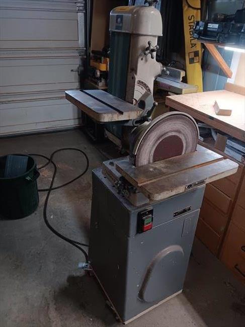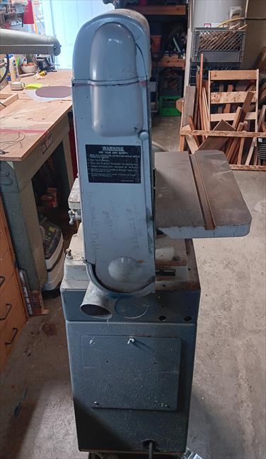 My friend alerted me to this being auctioned off locally, so I snatched it up. It was previously used in a metal shop as lots of metal dust had to be cleaned out of it, but once tuned up with fresh wood sanding paper it works great. All parts are original and in good shape, including the guards.