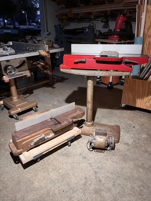 You might call this a FrankenJointer: I picked up the red jointer at Arnfest 2025 from a fellow OWWM'r The Pedestal stand was picked up in Louisville KY, and the second jointer was picked up near Hot Springs AR. The motor mount for the pedestal is from a belt and disk sander I picked up at Greers Ferry AR. The table is frozen on the jointer from Hot Springs but I got a working 1/2 HP motor, 113.19656 as well as a good blade cover and Craftsman40 badge from that find. I wanted to piece it all together to see if it worked and it did fine. I plan to do the restoration at some point and I will add those photos as well.