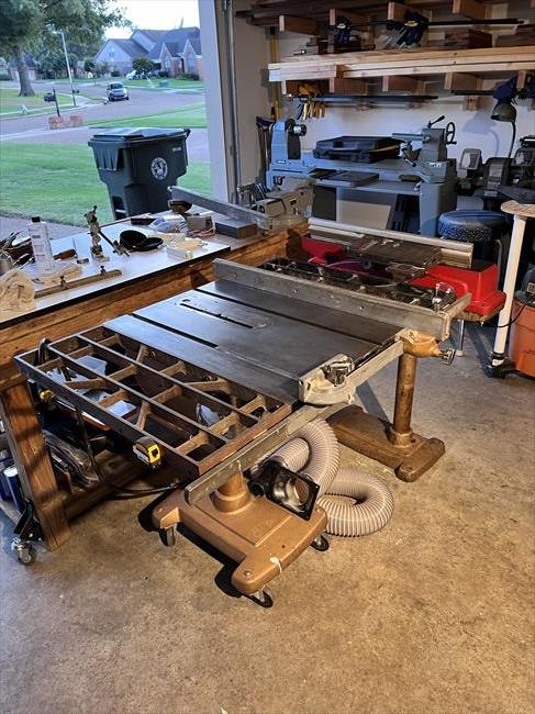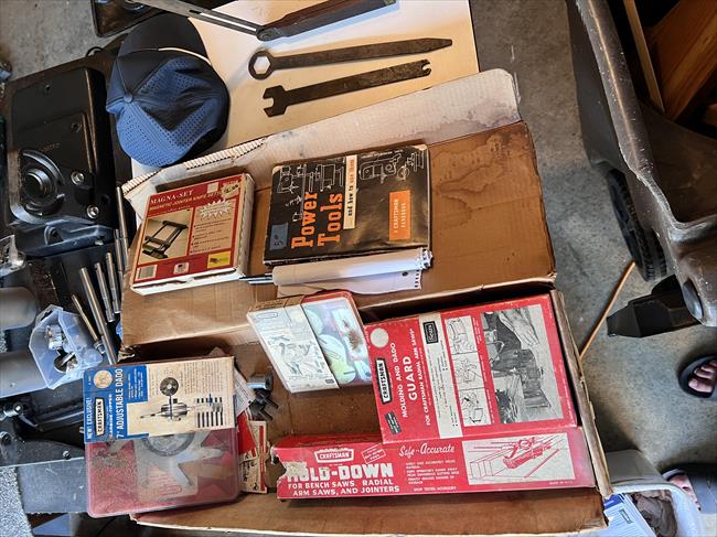 We picked this table saw up during ArnFest 2025 just a few miles from the Illinois Railway Museum. It works fine. I assembled it when we got back home and did a small project with it that same day. I also got a 3/4 Hp motor from a fellow OWWM'r, 115.7535, and hold downs, and a moulding blade set. At the swap meet I got a dado set, wrenches, Hold Downs in the box, and moulding and dado guard still in the box. I had planned to put the older motor on the saw that day, but noticed a break in the motor mount (Cradle). The current motor is a 1 HP 113.12170 and much lighter so I'm leaving that in place until restoration. I already have a new (old) cradle to use for the restoration. I actually moved my 10" Grizzly to the back of the shop because my plan is to use the Craftsman going forward. A big shout out to Suzy for finding this for me and for being such a cool partner in hunting vintage tools.
