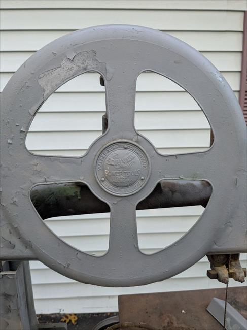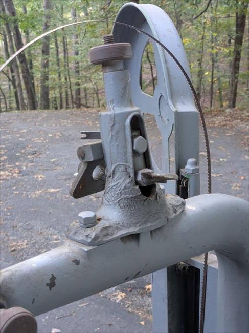 Picked this up for free from a local metalworker, the saw was originally purchased with the intention of converting the frame over to a small english wheel or similar metalworking tool. The upper wheel has broken free and the tensioning system is a mess of epoxy and fiberglass. The previous owner never got around to the project and let this one go for free just to make space. The saw appears to be otherwise complete, though many of the zinc guards are cracked and mangled beyond repair.