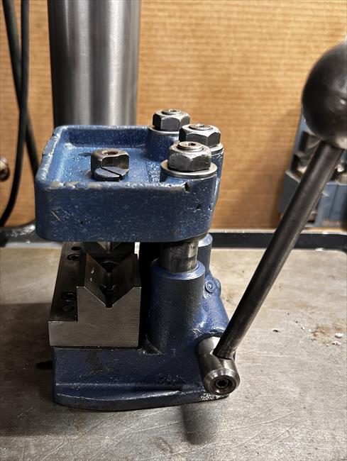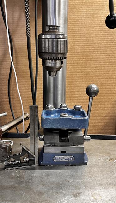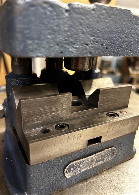 Close up front showing v-block and bottom of bushing sleeve that contacts round stock when jig is closed.
