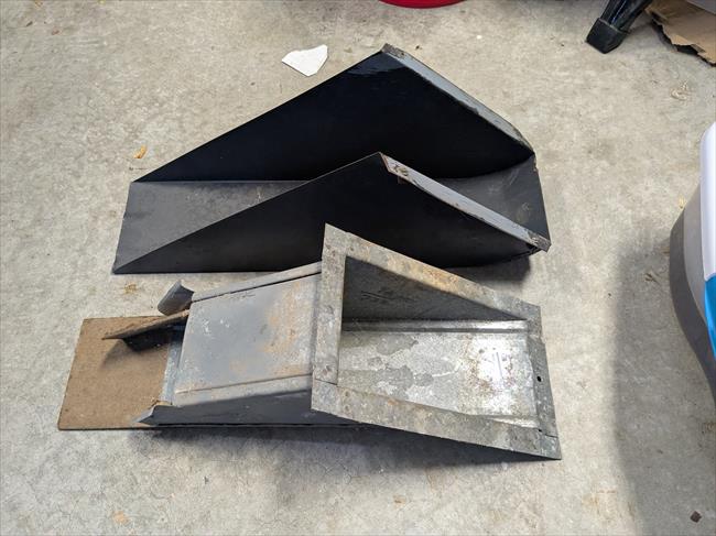 Comparison of the period correct splay leg stand chute vs. the later galvanized version. The older one is more effective and of much simpler construction.