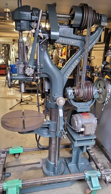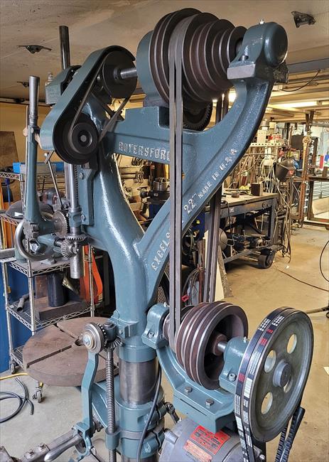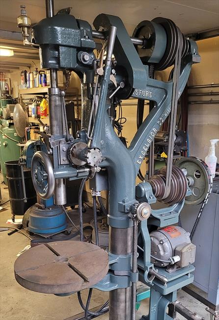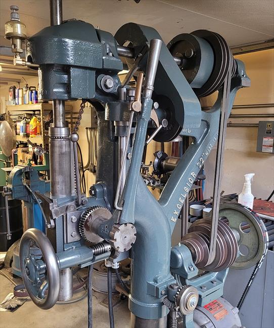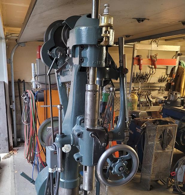 Purchased near Portland, Oregon in April, 2023 and hauled home to the Seattle area. The machine was complete including factory belt guards and feed kickout collar (usually missing). It took me about 3 months to restore. This machine used vee belts instead of flat belts and used pillow block ball bearings instead of poured babbitt bearings. This is the last camelback model ever produced. It cost about $1800 in 1971, or over $14,000 in 2025 dollars. All gears are intact and undamaged. Some minor castings were broken and brazed. In these pictures the table was in the same condition as received i.e. not yet cleaned. However, the table is fully functional as is. My intent was not to create a museum piece, but to make a clean functional drill press. It has a 2hp motor and 4MT spindle taper.