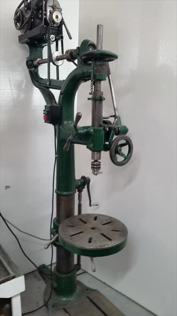 Sibley and Ware Camelback Drill Press with a 20” table. This was originally a flat belt drive but was repowered with an overhead mounted 2 Hp motor and 5 speed transmission. It has the original power feed with 7” range and a trip release.