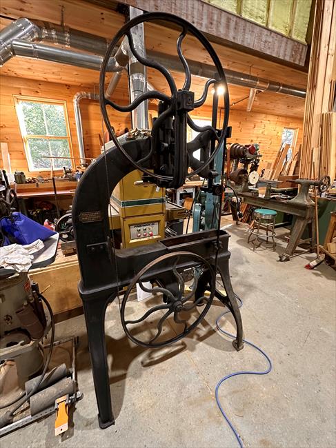 I picked this saw up in western Mass driving through Winchenden on the way. The P O had oiled the whole thing down pretty well so the drizzle on the 3 hour drive back didn't bother it a bit. These pictures were taken when it landed in my shop. She'll need tires and a motor. I'm leaning towards cherry for the table. It is however missing the tensioning mechanism which I hope to fabricate in some manner once I figure out how it functioned. I have a similar 32" left hand saw ( S.K.Lovewell) which will look great backed up to this one.