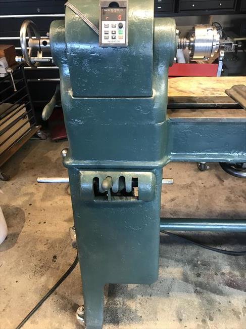 I acquired this machine and have since sold it. It's a massive cast iron machine that was once in a line shaft shop. It was a lot of work to clean this one up. It came with the what appeared to be the original leather belt. Sadly I managed to break it and had to replace it. I replaced the single phase motor that had been adapted to run the axle that ran from the tail end of the lathe to the drive the headstock with a 3 phase motor with VFD. The tailstock is massive!