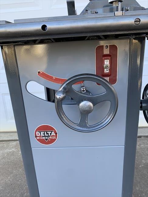 I picked this machine up 3 years ago from another OWWMer in Colorado who wasn’t going to have time to restore it. He only asked what he paid for it - $25. It apparently came from the relative of an older gentleman who had passed. We both found the saw on MarketPlace at the same time. I’m in Kansas and called to see if he would pick it up for me - he was already on the way to get it. According to the back story he got, the saw spent its entire life in a private, home shop. Other than rust on the cabinet, it was in remarkable condition. Serial number is 77-3425 which I believe puts it in 1947. Original motor, throat plate, switch and switch plate, blade guard, arbor wrench, fence w working micro adjust, mitre gauge, the works. The badges you’ll see in the pics are unrestored. I just removed them to have the cabinet sand blasted. I then painted the cabinet and reinstalled them. The remainder of the saw was disassembled, stripped, bearings replaced, de-rusted, new wiring installed, and then painted. I used Rustoleum Smoke Grey (light) and Charcoal Grey (dark) and decided to have some fun with the cabinet corners. I will say - The best way to disassemble one of these is to get it upside down on a workbench, then remove the tilt/elevation wheels and shafts - then you can unbolt the cabinet and remove it.
