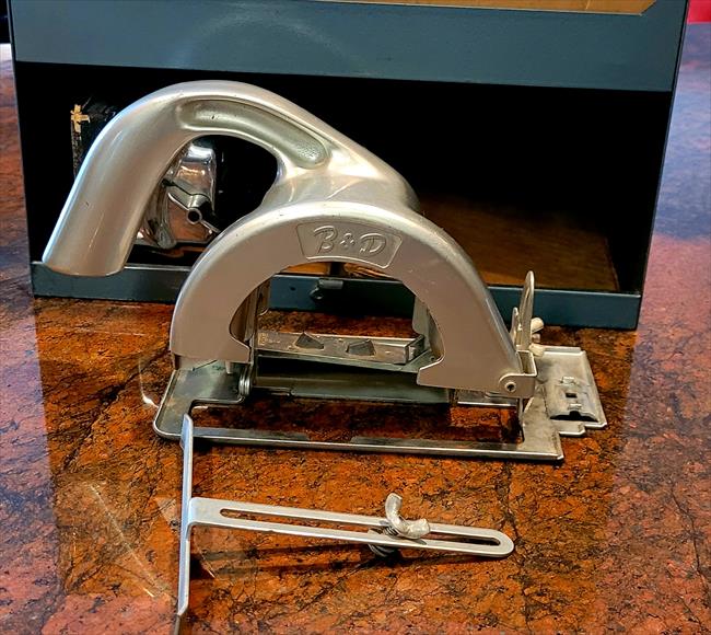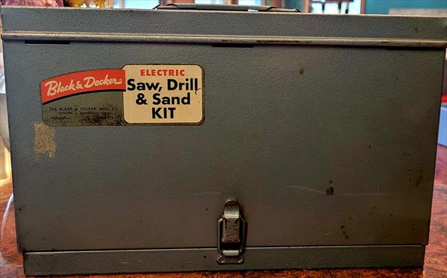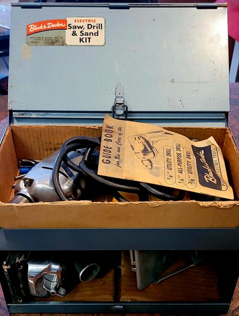 This is a 1/4" drill with circular saw and orbital sander attachments. Some parts are missing, but it's fun to look back at what they were marketing 70 years ago. I uploaded the manual as well. Oil soaked dirty paper.