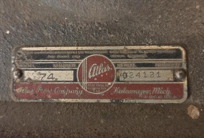 Was given this drill press in early 1990's from a doctor in Waukegan, Illinois, (moved it to southeast Michigan). He had purchased a new drill press and this one was not working. Original motor was not working, lubrication of spindle shaft was gummed-up, and tension spring was broken. Was able to order a spring for a 1990's era drill press and modify it to fit in this Atlas tension apparatus. Re-lubed spindle parts. Put in a Dayton, 1/2 HP, single phase motor. Replaced motor pulley which was bent. This press has a full tilting table and a 70-1/2" Jacobs Chuck. For woodworking I made an enlarged wooden table with a movable fence, and hinges for forward tilting if angled drilling is needed. This drill press has really worked well for my needs. I use it about 2 times a month, mostly for woodworking or rotary wire brushing of corroded metal parts. Used it as a makeshift lathe to make wooden handle for vintage hand crank bench grinder. I love this machine. From Machine Info publications, it appears that this Model 74 was made from about 1946 to 1948.