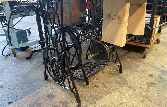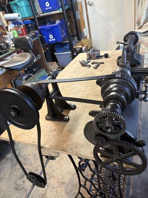 I purchased this machine in Victoria BC, Canada. the seller was selling it for a friend and knew nothing about its history. It had obviously been used but was missing some change gears and a chuck. Between the gears that came with it and some that I had on hand, I managed to make a combination that would allow the use of the lead screws. Research indicates that it originally came on a treadle powered stand. This one didn't have one, so I improvised with a Singer sewing machine treadle stand. It works, but I wouldn't want to make a living using it :).