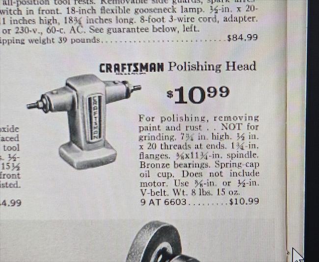 Obtained this item in early 1990's, from an estate sale of a deceased woodworking friend of mine. I have never used it. This is a Sears Craftsman, Cat. No. 9-6603 Polishing Head. As far as I could find out it was listed in Sears tool catalogs from 1959/1960 ($6.79) to 1969 ($10.99). I do not know what year in the 1960's this item was made or purchased.