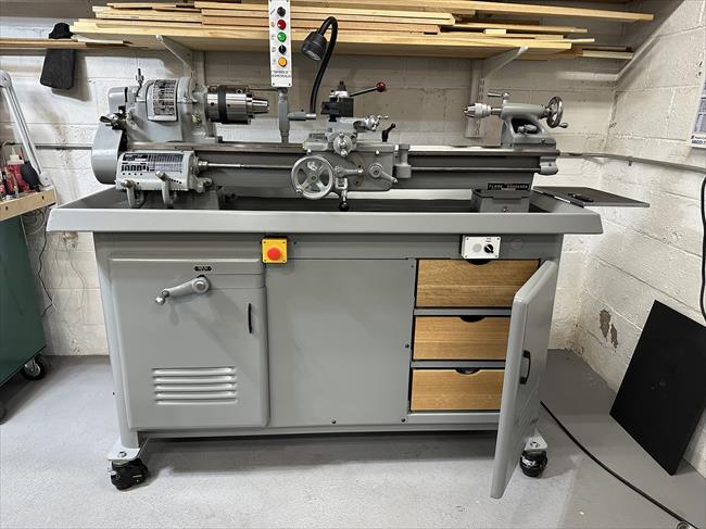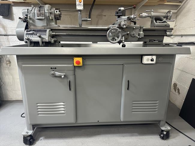 Purchased from someone who was going to restore it. He purchased it at auction from trade school. The lathe had already been taken apart almost entirely when purchased. There is about 80 hours in panel prep and general paint removal. All primed and then sprayed with Sherwin Williams custom matched oil enamel. Rewired completely. New Hitachi VFD for new 3 phase Baldor motor. The entire head casting was cleaned in an ultrasonic bath. Gearbox got all new bushings and bearings. Crossfeed and compound lead screw nuts were replaced. New drive belt, new oiler wicks everywhere. Holds .005 over 30 inches. I will be putting a DRO and tach on it in the fall.