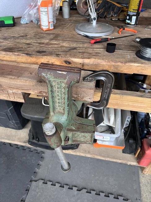 My wife and I won this vise at Arnfest South's raffle 4/11/2026. I don't have the name of the previous owner. It still needs cleaning up at this point and need a turret locking bolt. I made a bolt for it and tested it out. I found a video of the same vise on Youtube and copied that locking bolt. the locking bolt is 8 inches total length bent at 90 degrees at about 3 1/2 inches, with about 1 inch of 3/8 x16 thread. I drilled out a 3/8 inch nut at 25/64th so it would slid over the threads and I could weld it on the rod at about 1 7/8 inches from the bottom of the threads. The vise fully opens up to 7 1/2 inches from what I can determine at this point. Here is a link to the vice as it works now with the fabricated bolt. https://www.youtube.com/shorts/QlTFbiAeSeE