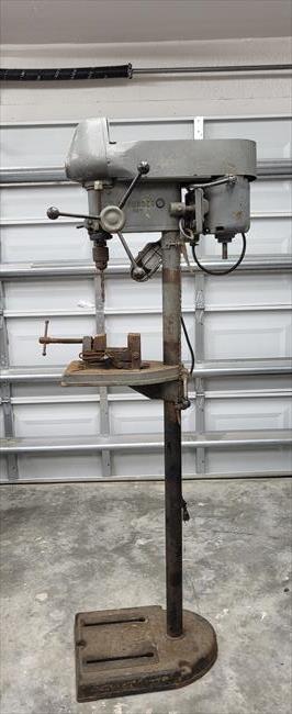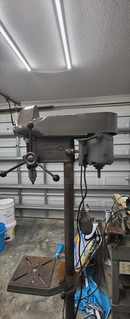 I picked this up in March 2026. It was in decent condition but needed work before it could be used. The spindle bearings were bad and replaced with 6202 5/8 bearings. The pulley bore is shimmed to fit snugly on the spindle sleeve. It still has the leather washer on the quill at the depth stop. Next to be addressed, I need a stepped motor pulley. When I first ran this i was a little nervous of the work needed. Afterwards, this is the smoothest running drill press I've owned so far. Im very happy with it. It seems originally it was gray, then painted lime green, then gray again. I blasted it and painted it rustoleum hammered paint possibly gray,,I can't tell. It looks brown in low light and dark gray in bright light. Next I will sand down the column and then the table and base will get refinished.