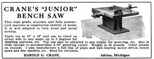 In 1920, following the death of his mother, Crane returned to his boyhood home in Adrian, Michigan and continued making his tablesaws. He added another model of tablesaw, and also began making a disk sander.