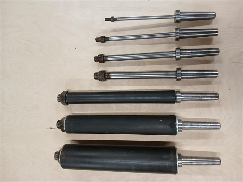 These are seven spindles for the State B-4 Spindle Sander. They take the following size sanding sleeves. 2x9, 1 1/2x9, 1x9, 5/8x6, 1/2x6, 3/8x6, 1/4x5. If you need a larger diameter, larger diameter rubber drums are available from various sources. As a bonus you get seven metal sanding sleeves. These are definitely used but still appear to have grit on them. The price includes shipping. Thanks for looking. |