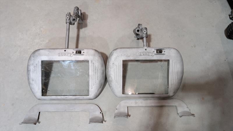 2 Surty guards from 12" bench grinder. These guards are huge. about 10" x 14" 2 lamps each. I sandblasted them so they should be ready for paint if you want. I'll be replacing the light sockets with updated ones and putting in LED bulbs. They both have the original safety glass installed. One of them has a sacrificial piece of single strength glass installed, the other has just the safety glass, but another secondary piece could be added. they are not perfect, one bracket was welded at some point. It's where it attaches to the machine. It also has had one set screw drilled out and replaced with a larger bolt for fastening. any questions, please ask. |