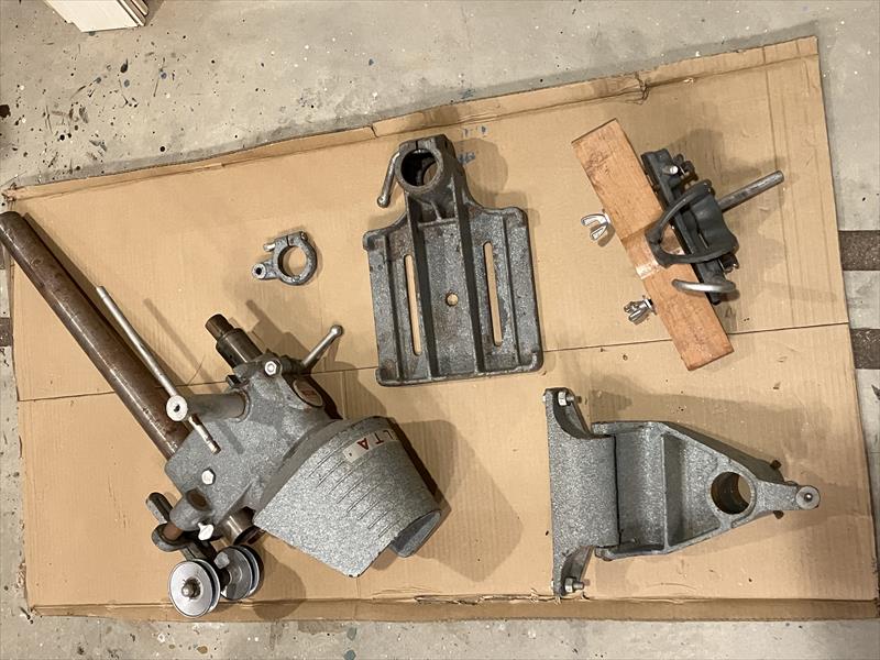 This is a DeltaShop drill press. Catalog # 11-105, This is not a free standing drill press, but connects to a table saw as a multi-tool combo device. The parts do match the bench model from Delta - you could part this out. I can send the sales book about this vintage tool. Some rust as seen. The spindle is brand new with box. This is a fairly rare vintage tool which originally fit the DeltaShop multi-tool. This was originally purchased by my father-in-law about 1960. This drill press is very similar to the wildly popular bench top Delta Homecraft 11" Drill Press, catalog No. 11-100. The parts should be interchangeable. |