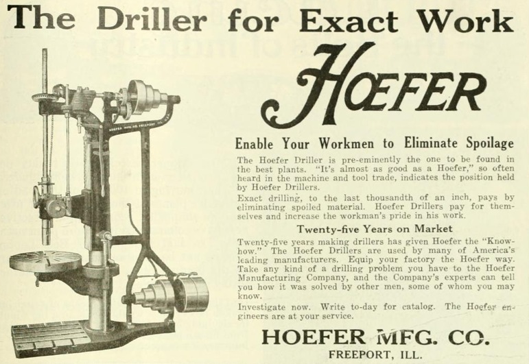 The company survived until at least 1963 as Hoefer Manufacturing Co., Inc., makers of a full range of drilling, boring and tapping machinery plus power hacksaws.