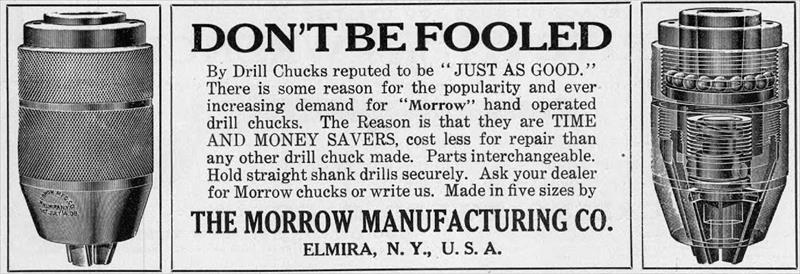 Between about 1907 and 1913, Morrow Manufacturing Co. made hand-operated self-tightening drill chucks. In March 1913 it was announced that Morrow's drill chuck line, including all patent rights, had been acquired by E. Horton & Son Co.; that firm continued to manufacture Morrow drill chucks for some years.