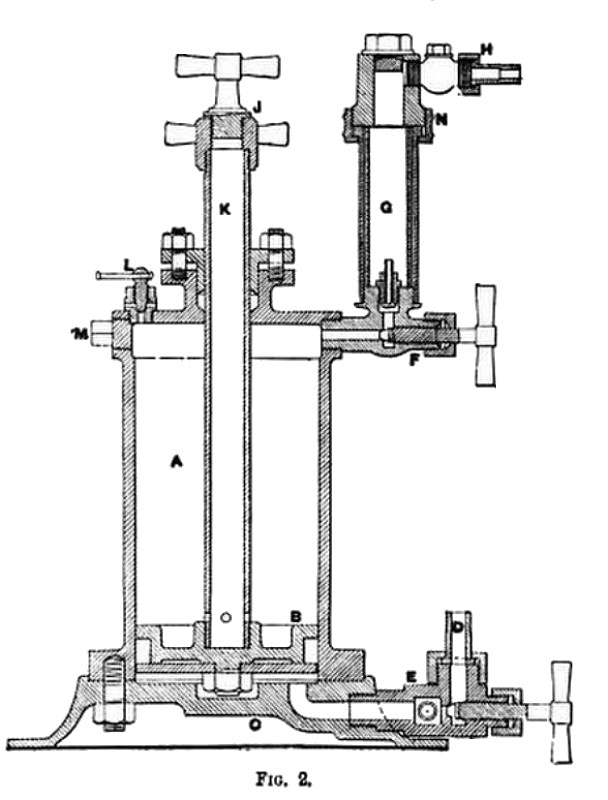 The method of working is as follows: When the piston B is at the bottom, and the chamber filled with oil, steam is admitted through the pipe D by opening the lower valve to the underside of the piston, the area of which is larger than the top side by the amount of the area of the rod K. This difference of area causes the piston to be raised within the cylinder, and so displaces the oil above, which finds its way out to the engine steam pipe or chest through the upper valve F, past the sight-feed G and connecting pipe H.