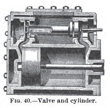 The Armington & Sims Engine—Two recent styles of Armington & Sims engines are shown in Fig. 38 & 39. The first is a double compound engine with cranks at 180°, and the second is known as a special double engine, especially designed for electric-lighting on board of steamships, where saving of space is a prime requirement. Numerous other forms of engine are built by the Armington & Sims Co., of Providence. R. I., such as vertical double acting compound engines, etc., all of which are developments from the original engine built by this company with a single cylinder. A section of the cylinder and valve of the Armington & Sims engine is shown in Fig. 40. The steam-chest, with valve-seat, is in one casting with the cylinder; the valve-chest is enclosed by a cover in the usual manner. It will be seen that the steam-chest is filled with live steam, which surrounds the valve, and that by taking steam in the center of the valve and exhausting at each end, the steam-ports from the cylinder can be very direct, and the waste-room kept small. In the engraving the valve is shown as just taking steam into the cylinder-port at the piston-end; the port in the valve at the other end is also just taking steam from the steam-chest into a port which passes through the valve into the same cylinder-port: this enables steam to be taken very quickly at the commencement of the stroke. The steam is exhausted at each end of the valve by direct passages which quickly free the cylinder. The piston is hollow, fastened by a taper fit to the rod, and furnished with two snap-rings. The valve is a hollow piston-valve, with cast iron ends, made very light, with a body of steel tubing. It is ground, and perfectly balanced. |