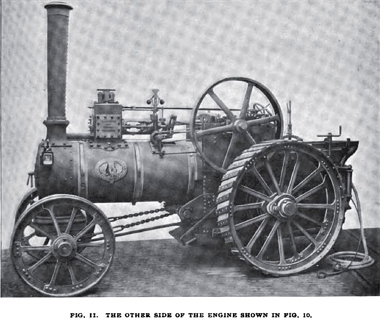 In Figs. 10 and 11 are shown both sides of a very well designed agricultural locomotive, made by the well known firm Messrs. Marshall, Sons & Co., of Gainsborough. These traction engines have been improved from time to time and possess all the latest devices suggested by a long experience. It is impossible to speak too highly of the efficiency and good workmanship of Messrs. Marshall's productions. The cylinder is thoroughly steam-jacketed, and the steam supply, the circulation and the drainage of the neater appearance. Some of the gearing is placed in the box bracket; the remaining gearing outside the plate is effectively covered in to protect it from dust and dirt. The steerage worm wheel is placed inside the bearing, instead of outside, as is the usual practice. The engine is fitted with strong compensating gear, a slip winding drum and all the usual tools and appliances for rendering the engine complete and ready for any emergency to be met with in regular threshing or occasional hauling work. |