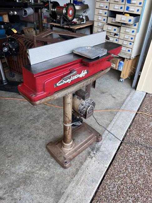 You might call this a FrankenJointer: I picked up the red jointer at Arnfest 2025 from a fellow OWWM'r The Pedestal stand was picked up in Louisville KY, and the second jointer was picked up near Hot Springs AR. The motor mount for the pedestal is from a belt and disk sander I picked up at Greers Ferry AR. The table is frozen on the jointer from Hot Springs but I got a working 1/2 HP motor, 113.19656 as well as a good blade cover and Craftsman40 badge from that find. I wanted to piece it all together to see if it worked and it did fine. I plan to do the restoration at some point and I will add those photos as well.
