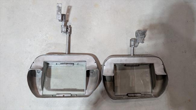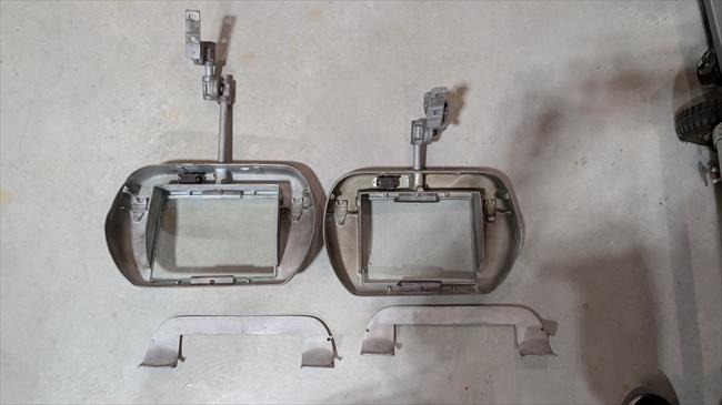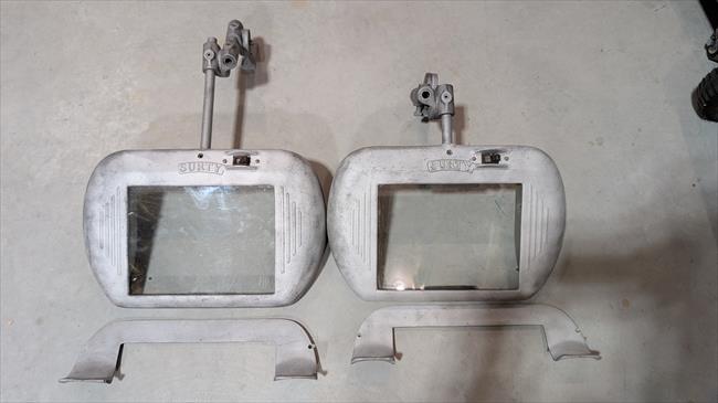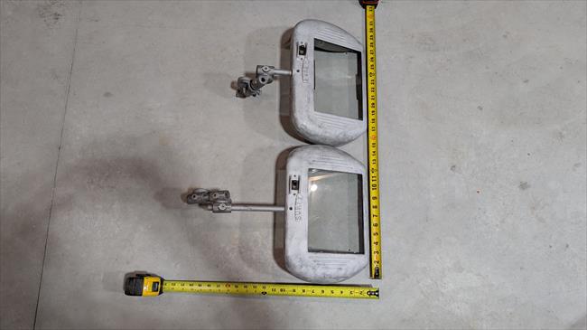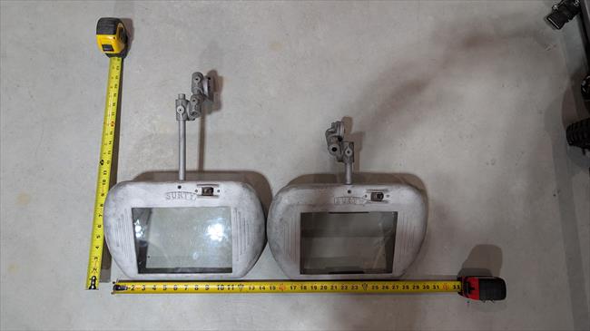 Salvaged from giant bench grinder. I needed the pedestal for another project, but these were too nice to scrap. I sandblasted them and will be rewiring them with new light sockets. all intact and all pieces are there. They are not perfect, but completely usable. one mounting bracket has been welded at some point, and a set screw has been drilled out and replaced with larger bolt for adjustment knuckle. Im guessing they are from the mid 40's based on the bench grinder they were mounted to.