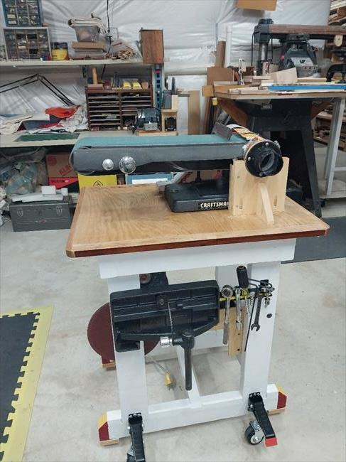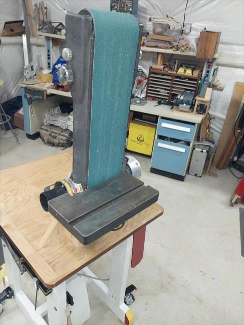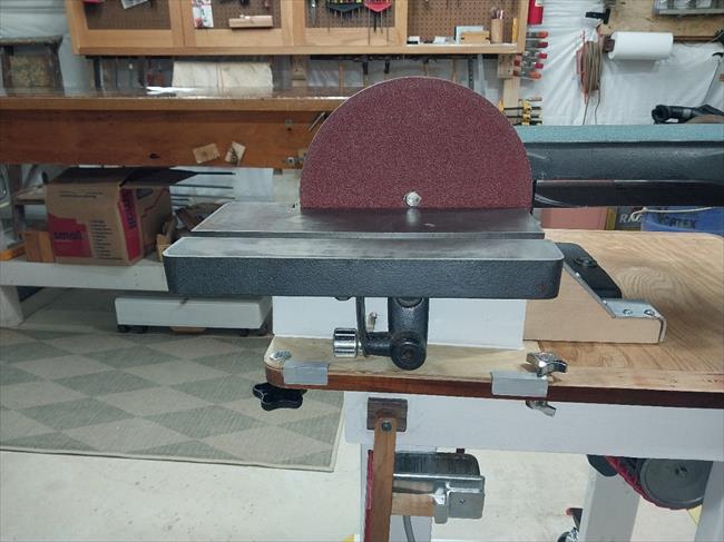Sander on stand. Magnetic bar holds aux table and the various wrenches for adjustments. The disk is in the storage position on the inside of the table leg.