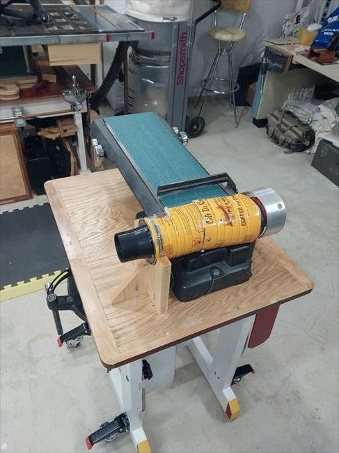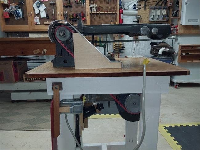 I’m happy with the sanding capabilities of the machine, it’s very solidly made, nice big flat cast iron platen and disk. The deficiencies, compared to the Delta sanding centers, are in the amenities. There is zero provision for dust collection, no guard behind the disk, no belt guard. [The old Sears catalogs do show an optional belt guard that can be used with the Sears stand for this machine, but that only covers the belt below the top of the stand, not by the drive roller.] So I had to build dust collection and belt guard into my stand.