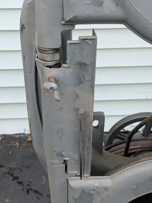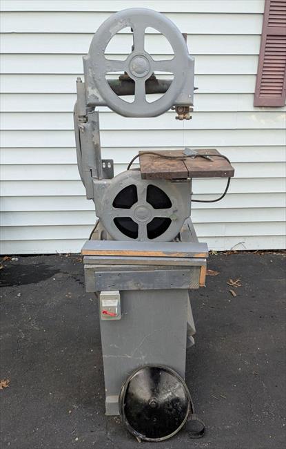 Picked this up for free from a local metalworker, the saw was originally purchased with the intention of converting the frame over to a small english wheel or similar metalworking tool. The upper wheel has broken free and the tensioning system is a mess of epoxy and fiberglass. The previous owner never got around to the project and let this one go for free just to make space. The saw appears to be otherwise complete, though many of the zinc guards are cracked and mangled beyond repair.