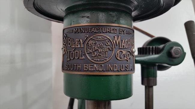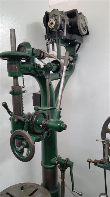 Sibley and Ware Camelback Drill Press with a 20” table. This was originally a flat belt drive but was repowered with an overhead mounted 2 Hp motor and 5 speed transmission. It has the original power feed with 7” range and a trip release.