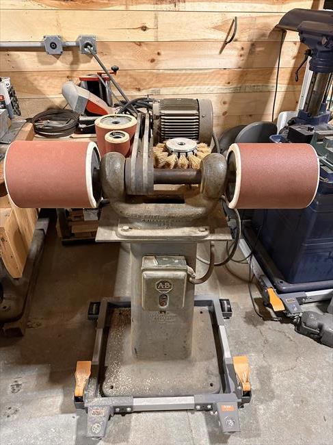 I purchased this locally with some other equipment. It was in working condition with various sized drums. Pulley driven by a two horse three phase motor and to mount the motor someone had bolted a steel plate between the arbor and the pedestal.