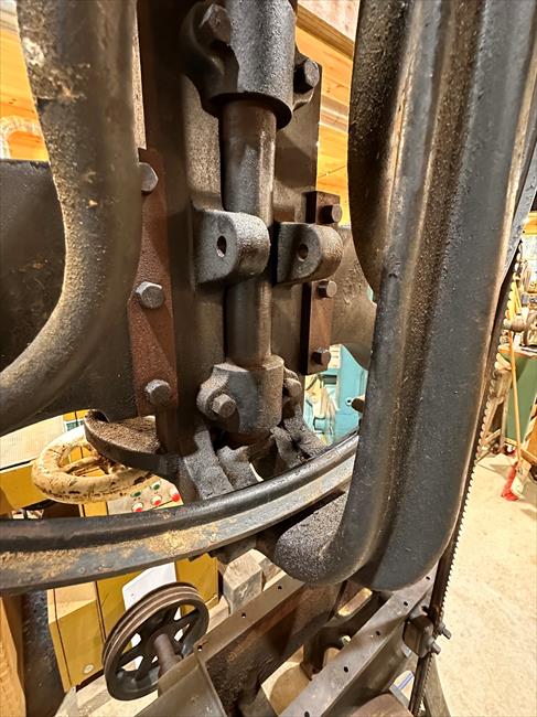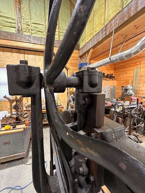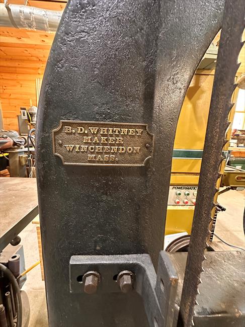 I picked this saw up in western Mass driving through Winchenden on the way. The P O had oiled the whole thing down pretty well so the drizzle on the 3 hour drive back didn't bother it a bit. These pictures were taken when it landed in my shop. She'll need tires and a motor. I'm leaning towards cherry for the table. It is however missing the tensioning mechanism which I hope to fabricate in some manner once I figure out how it functioned. I have a similar 32" left hand saw ( S.K.Lovewell) which will look great backed up to this one.