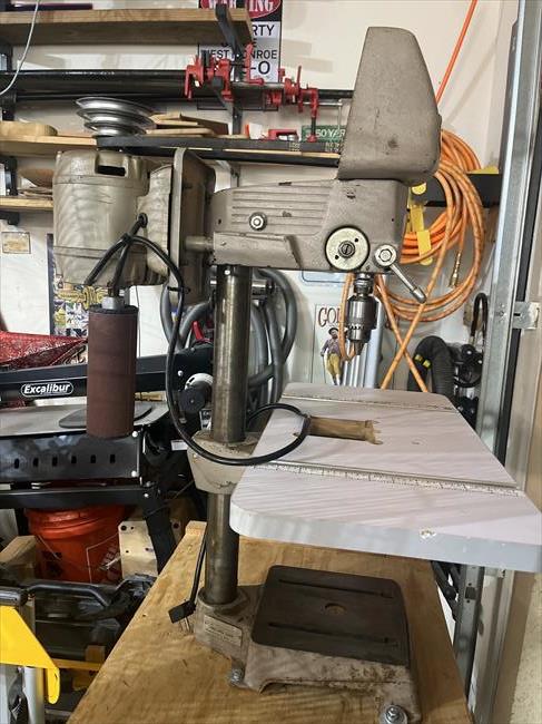 The drill press was given to me by a friend. I live in Arizona and a snowbird from Michigan had to move back home so he gave it to me. It works so well that I got rid of my Harbor Freight drill press and use this one as my primary. I do need to replace the feed handle two of the arms were broken off. And a thrust collar above chuck is missing. But is a very solid machine. My goal is to eventually refurbish it sandblast it and paint it.