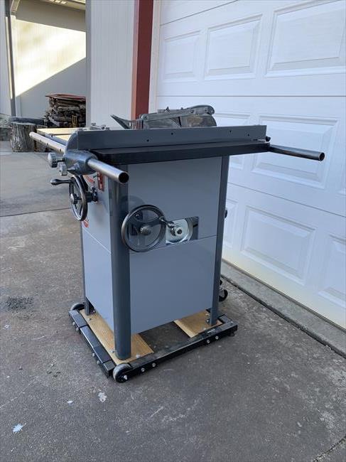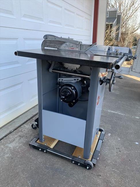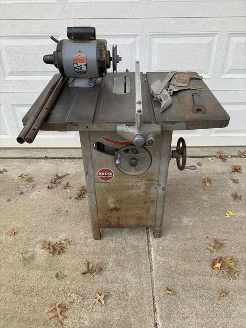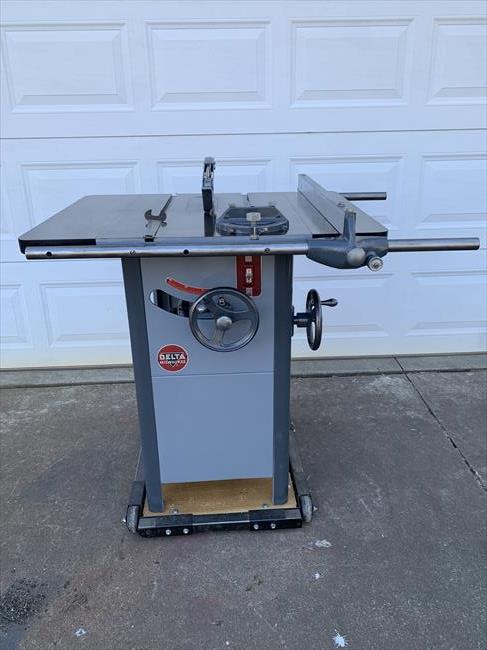 I picked this machine up 3 years ago from another OWWMer in Colorado who wasn’t going to have time to restore it. He only asked what he paid for it - $25. It apparently came from the relative of an older gentleman who had passed. We both found the saw on MarketPlace at the same time. I’m in Kansas and called to see if he would pick it up for me - he was already on the way to get it. According to the back story he got, the saw spent its entire life in a private, home shop. Other than rust on the cabinet, it was in remarkable condition. Serial number is 77-3425 which I believe puts it in 1947. Original motor, throat plate, switch and switch plate, blade guard, arbor wrench, fence w working micro adjust, mitre gauge, the works. The badges you’ll see in the pics are unrestored. I just removed them to have the cabinet sand blasted. I then painted the cabinet and reinstalled them. The remainder of the saw was disassembled, stripped, bearings replaced, de-rusted, new wiring installed, and then painted. I used Rustoleum Smoke Grey (light) and Charcoal Grey (dark) and decided to have some fun with the cabinet corners. I will say - The best way to disassemble one of these is to get it upside down on a workbench, then remove the tilt/elevation wheels and shafts - then you can unbolt the cabinet and remove it.