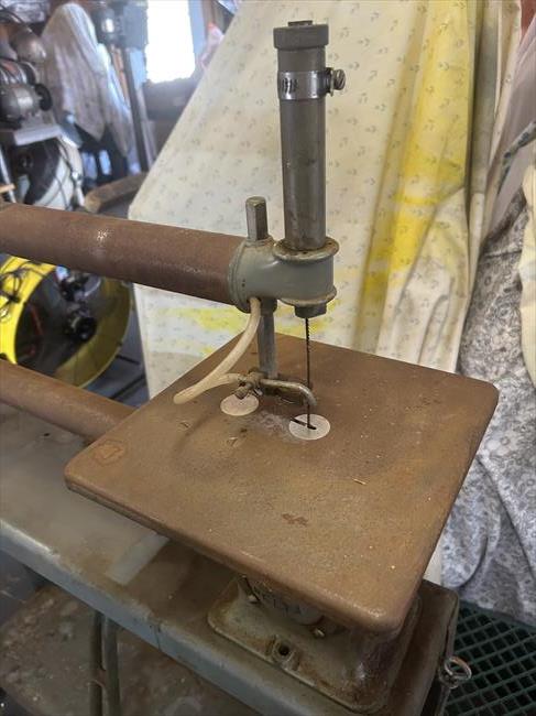 This saw also has a the Delta 458 Mortiser installed on it. I thought it was just something the owner installed but I saw in the old catalogs that Delta sold these combination machines which included the mortisers, and there was one that was the Model 700 scroll saw and mortiser combo. This is the one I now have. Mine is set up with the Drill chuck and is missing all the hold down parts and any mortising chisels etc., but it appears to be in good shape under the sawdust and grime, and does have the foot pedal option.
