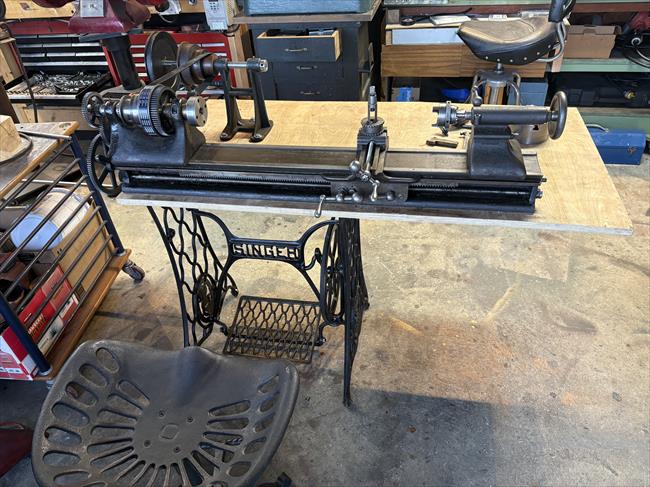 I purchased this machine in Victoria BC, Canada. the seller was selling it for a friend and knew nothing about its history. It had obviously been used but was missing some change gears and a chuck. Between the gears that came with it and some that I had on hand, I managed to make a combination that would allow the use of the lead screws. Research indicates that it originally came on a treadle powered stand. This one didn't have one, so I improvised with a Singer sewing machine treadle stand. It works, but I wouldn't want to make a living using it :).