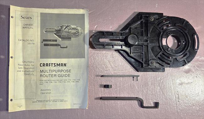 Comments: Given to me from my father around 2004. No idea where he got it from. Never saw it in his house or seen him use it. This was given to me at the same time as the Craftsman Router 315.17310 which was manufactured in 1981. The instruction guide that came with this router guide has a date of Sept. 1980, but the instructions for the router has a date of May 1981. I suspect then, that this guide was purchased from Sears in 1981. The 1979 catalog does not include this item. There is no Sears 1980 Catalog posted yet; this accessory may have first, been included in that year's catalog. The 1981 Catalog (page 17) is the first documentation I could find at $14.99. This item was still in the 2004-2005 Sears Catalog, at $19.99. When I received this Multipurpose Router Guide all of the parts came loose in a box, along with other tools. I had no idea what all of the parts were for, but I kept them thinking someday I might figure out what they were for. Lucky for me the 9-25179 Owners Manual came with this accessory. While taking pictures this week of this router guide I opened the manual and saw diagrams of these parts that I never new what they were for. Miraculously, I was able to find all of the parts diagrammed in the manual, scattered in four completely different drawers and work benches. I have titled all of the parts in the first photo.